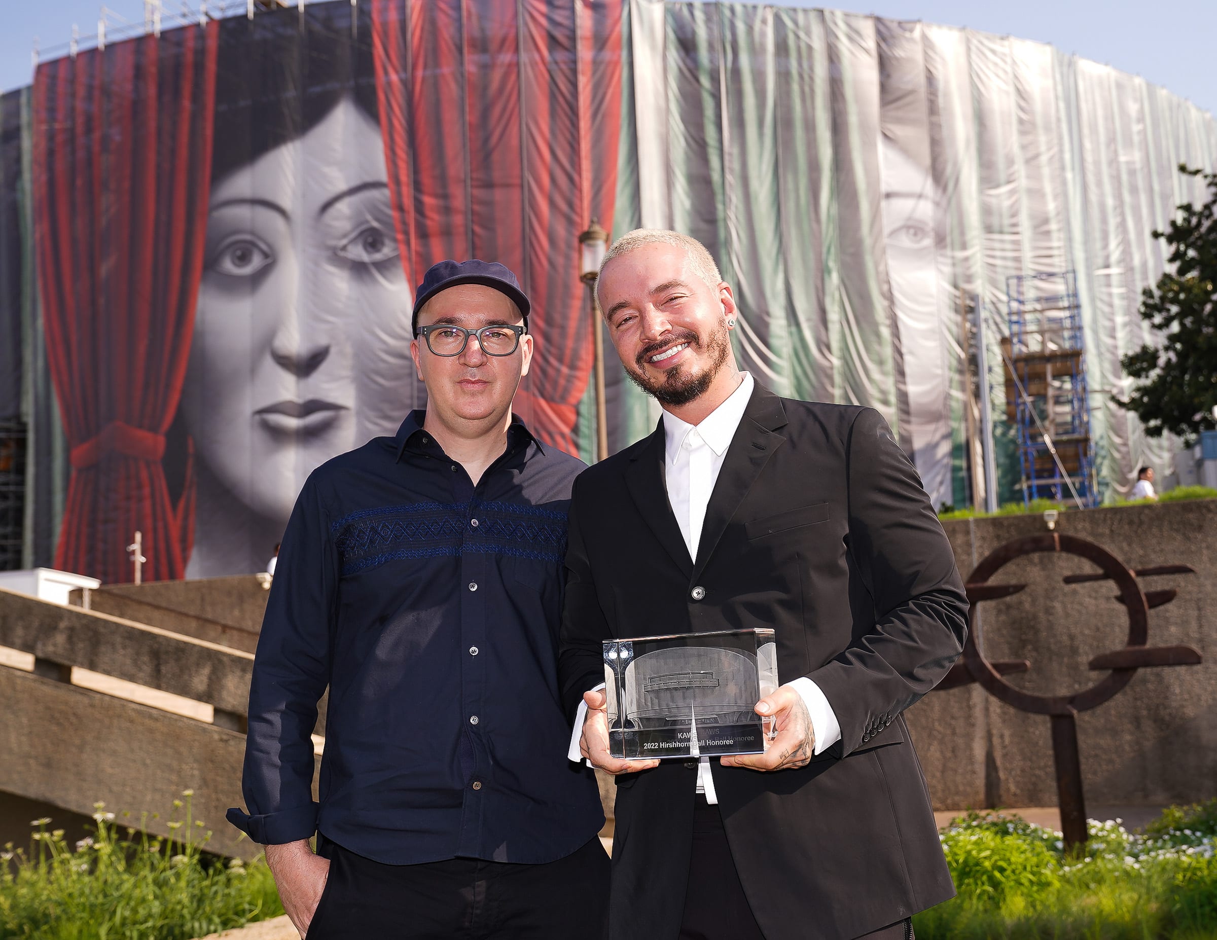 KAWS (left) and J Balvin (right) in the Hirshhorn Sculpture Garden. Courtesy of the Hirshhorn Museum and Sculpture Garden. Photograph by Tony Powell.