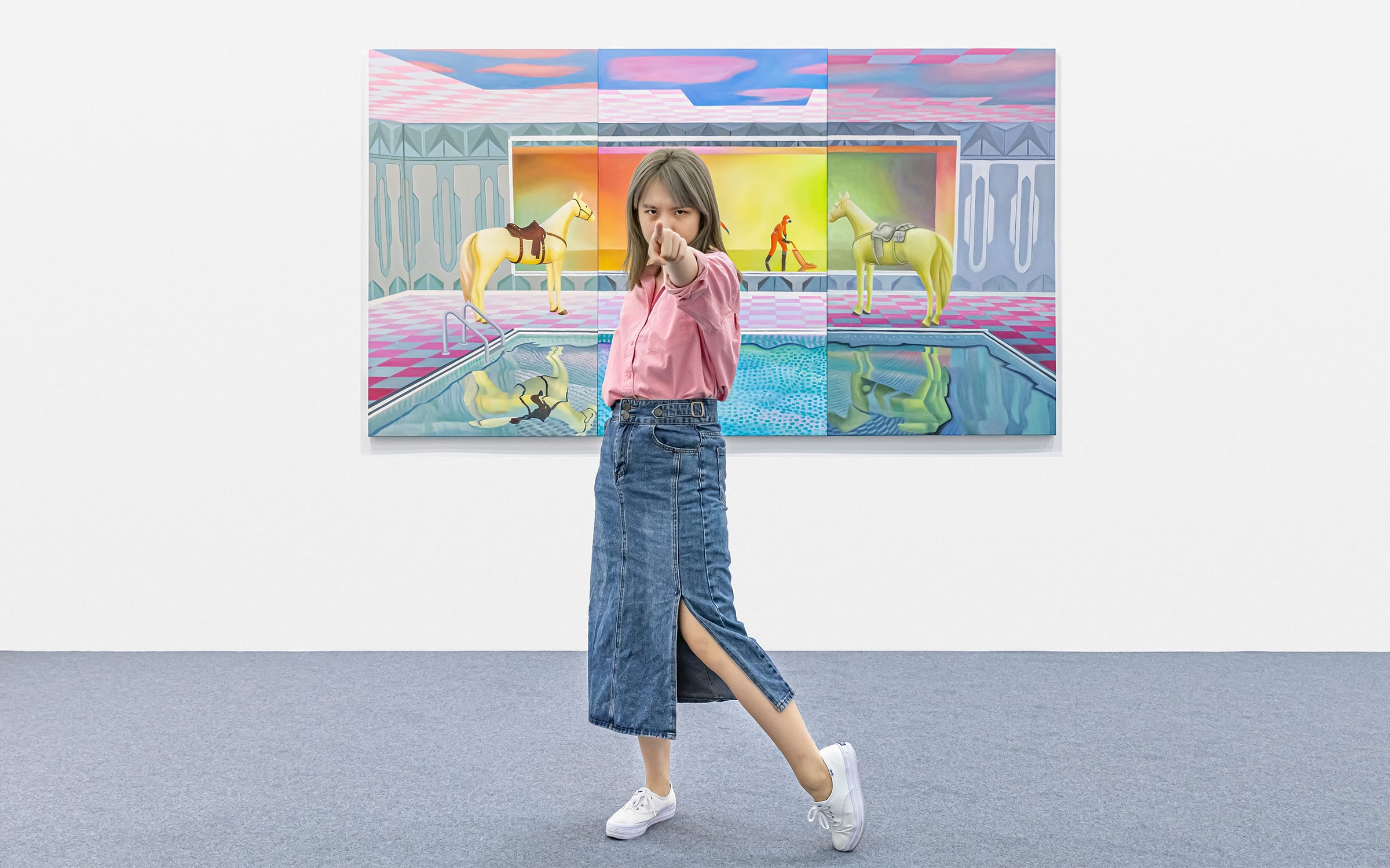 À gauche: Antonia Kuo dans son atelier. À droite: Antonia Kuo, Fugue, 2023. Avec l'aimable permission de l'artiste et de Chapter NY. Photographie de l'œuvre de Charles Benton.